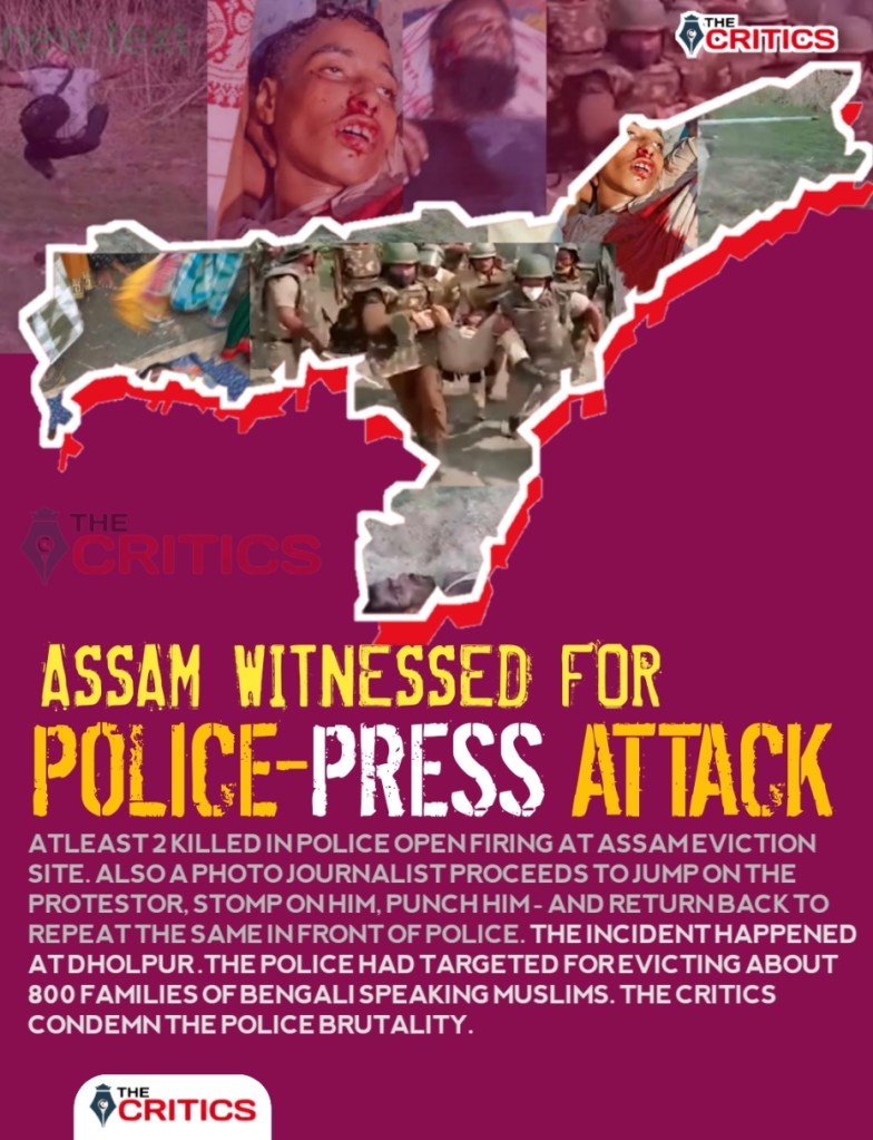 ATLEAST 2 KILLED IN POLICE OPEN FIRING AT ASSAM EVICTION SITE. ALSO A PHOTO JOURNALIST PROCEEDS TO JUMP ON THE PROTESTOR, STOMP ON HIM, PUNCH HIM – AND RETURN BACK TO REPEAT THE SAME IN FRONT OF POLICE. THE INCIDENT HAPPENED AT DHOLPUR .THE POLICE HAD TARGETED FOR EVICTING ABOUT 800 FAMILIES OF BENGALI SPEAKING MUSLIMS. THE CRITICS CONDEMN THE POLICE BRUTALITY.